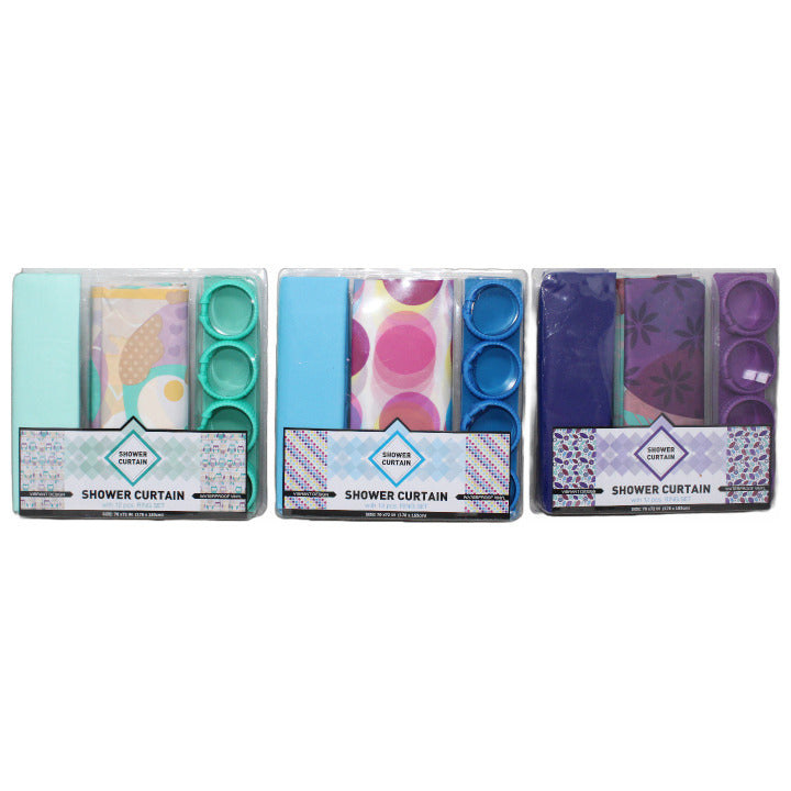 Wholesale 70" X 72" Peva Shower Curtain with liner and plastic hooks, 3 asst colors, Packaging: clamshell with color insert, UPC: 810002208102