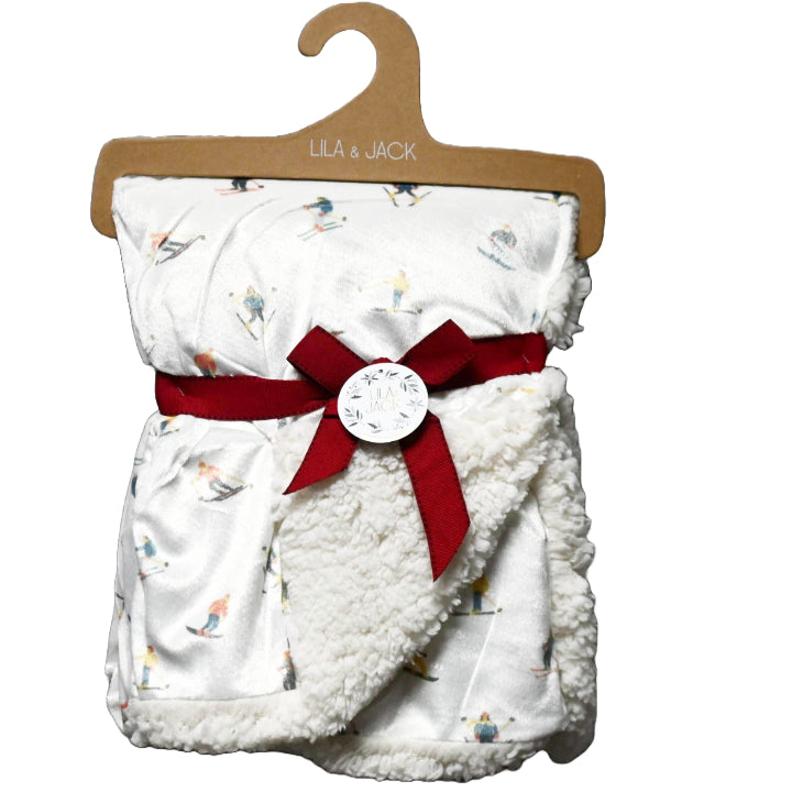 Wholesale 1pc 30x40" White Ground Skiers Print Mink/Sherpa Blanket C/P 48